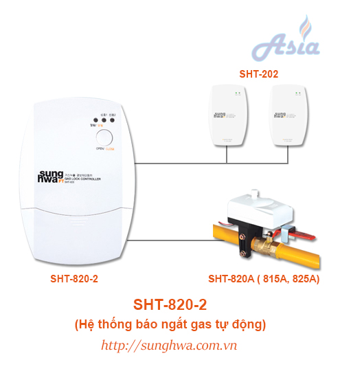 Bộ điều khiển trung tâm SHT-820 (SHT-820-2) có thể kết nối với 2 đầu dò và 1 van ngắt loại cơ (size 15A, 20A, 25A), có nhiệm vụ cấp nguồn và báo động khi nhận được tín hiệu báo rò rỉ gas từ đầu dò, điều khiển đóng van cơ tự động.