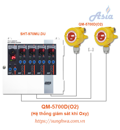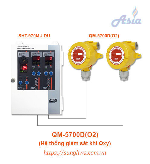Cảm biến QM-5700D kết nối với tủ điều khiển SHT-970MU.DU, trên tủ có màn hình hiển thị nồng độ O2 cho từng cảm biến. Thiết bị được sản xuất bởi Sunghwa Future & Technology, nhập khẩu và phân phối chính hãng bởi Asia Gas, đầy đủ CO-CQ, bảo hành 12 tháng.